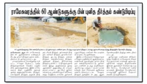 e highlight however is the ‘Dharmar Teertham;. After having located and identified the Dharmar Teertham, now we have identified fresh water inside the almost intact structure buried inside the sand dunes for almost a century now. The find of fresh water inside the sand dune covered Teertham hit the headlines in a sensational manner. A flood of newspaper reports followed. Pilgrims as well as local residents visited the Teertham and the renovation work is going on in full-swing.